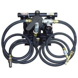 AME Graco Calcium Chloride Pump is a 50 gallon (189 liter) capacity, 1 to 1 ratio double diaphragm pump. Includes 10' (3 meter) heavy duty rubber hoses, 2-way shut-off valve, ejector gun and protected gauges. The unit is portable with a base plate for mounting in a service vehicle. Ships with adapters to fit both large bore and standard valves. Weight: 38 lbs.