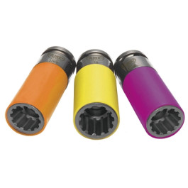 AME 68025 SUV/Lt. Truck Spline Plus Socket Set includes 22mm, 7/8" and 15/16" sockets (1/2" drive impact rated). Works in cases of corrosion, rounded heads, thin walls for specialty aluminum wheels, etc. Easily removes at least 6 different fastener types: spline, 6-point, 12-point, torx, square, and 50% rounded off heads. Manufactured using quality chrome molybdenum alloy steel for high strength and durability. Color coated protective sleeves for easy identification and prevents damage to finish on alloy wheels.
