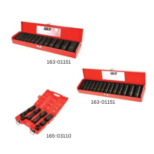 The Ascot 1" Drive 10-Piece Trucket Socket Set includes the following sizes: 13/16" square, 1-1/16", 1-1/8", 1-1/4" thin wall deep, 1-1/2" controlled standard socket, 17mm x 21mm square with inside lip, 33mm, 35mm, 41mm deep.