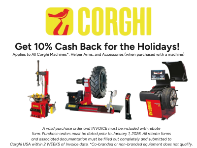 Corghi Rebate Form must be submitted along with purchase order and invoice within 2 weeks of invoice date. Co-branded and non-branded equipment does not qualify. Offers good through December 31, 2025.