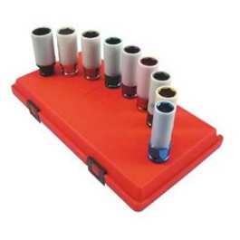 Ascot 1/2" Drive Extra Thin Wall 9 Piece SAE & Metric Wheel Protector Socket Set. The durable outer sleeve and insert protects high polished wheels and lug nuts from damage. Contains the following sizes: SAE - 3/4" (light green), 13/16" (purple), 7/8" (green), 15/16" (brown), 1" (silver) 1-1/6" (black); Metric - 17mm (blue), 19mm (yellow), 21 mm (red).