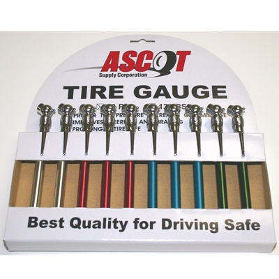 Ascot 476-00941 Motorcycle Tire Gauge Display (10 Gauges). A compact display of 10 tire gauges in a variety of colors. Can be hung or is self-standing for a counter display. All 10 gauges are for 20-120 PSI.