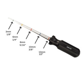 This handy color-coded injury measuring tool is designed to make tire repair jobs easier and faster. This tool has heavy-duty screwdriver style handle and quickly measures the size of the injury allowing for proper sized repairs. Similar to the Tech TRT105.