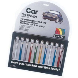 Ascot 476-00211 Tire Gauge Display (10 Gauges). A compact display of 10 tire gauges in a variety of colors. Can be hung or is self-standing for a counter display. All 10 gauges are for 10-50 PSI.