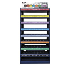 Ascot Metal Wheel Weight Rack features 64 weight locations (8 shelves, includes dividers). Comes with square tube to support. Dimensions are 52 148; tall x 27-1/2 148; wide x 8 148; deep.