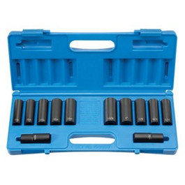 GP 1/2" Drive 12 Piece Extra Thin Wall Deep Impact Socket Set For Wheel Nuts / Set Contains: 3/4", 13/16", 7/8", 1", 1-1/16", 17mm, 19mm, 21mm, 22mm, 23mm Extra Thin Wall Deeps and 3/4" x 13/16" Flip Socket and 19mm x 21mm Flip Socket.