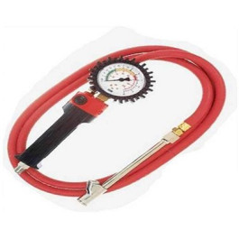 Haltec Air Master Dial Gauge with 6' Hose Length and CH330OP air chuck. The inflator is compact with an ergonomic design that makes the gauge comfortable to operate and easy to use. One button allows the operator to inflate or deflate. The gauge reads from 4 to 140 PSI in 2 lb increments and is also calibrated from 0 to 10 bars in .1 bar increments. The dial gauge is protected with a ribbed shroud.