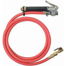 Haltec Inflating Gauge with 6' Hose Length and CH360OP clip-on air chuck. Features a lightweight aluminum body with brass movement and o-ring seals. Calibrated 10-120 PSI in 2 lb increments.