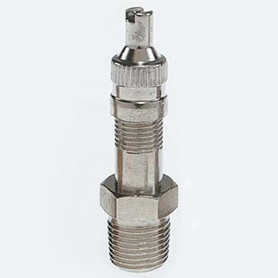 Haltec Tank Valve with 1-5/16" OAL, 1/8" NPT thread, .305-32 cap thread and 7/16" hex size. Utilized on pressure containers where gauging or servicing may be required. Ascot Part #468-00399.