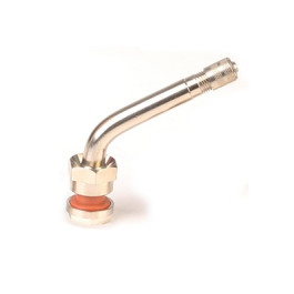 Import 554D Nickel Plated Brass Valve with Grommet (Metric) for use with aluminum wheels with a 9.7mm valve hole and a rim thickness of .218" to .330" at the valve hole. Recommended torque at installation of 80-125 in-lbs. Length from grommet to bend of the of the valve is 0.98". Length from bend to the top of the valve is 1.94". Bend is 60°.