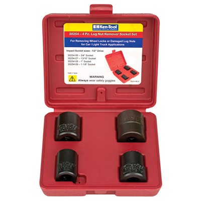 Kentool 4 Piece Lug Nut Remover Set is used for removing wheel locks or damaged lug nuts. Internal tapered reverse thread locks onto damaged nut and easily removes with the use of a 1/2" Impact Wrench. Comes in a convenient plastic storage case. Sizes include: 3/4", 13/16", 1", and 1-1/8". Each size available individually.