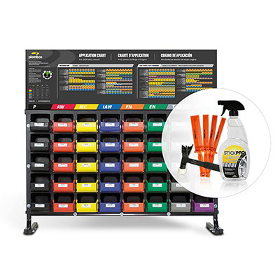 This is an empty version of the 1000KIT, the basic kit for the Tire Professional. The pre-labeled, color-coded bins are supported on a bench mount display with descriptive header. This system includes 40 pre-labeled color-coded bins, dividers, Application Chart and Alloy Wheel Gauge.