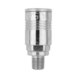 Milton P-Style (Tru-Flate / Parker Interchange Series - 3/8" Basic Size) Coupler with 1/4" NPT male connection. P-Style coupler bodies are heavy duty steel, with 8 locking balls. Maximum inlet pressure of 300 PSI. Maximum temperature of 250° F. Air flow of 68 SCFM. Seals: Buna-N. For use with shop air only.