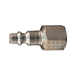 Milton M-Style (Industrial Interchange Series - 1/4" Basic Size) "Kwik-Change" Plug with 3/8" NPT female connection. Plug is case hardened steel plated to resist rust. Will comply with the dimensional requirements of military specification MIL-C-4109. Maximum inlet pressure of 300 PSI. Maximum temperature of 250° F. Air Flow of 30 SCFM. Seals: Buna-N. For use with shop air only.