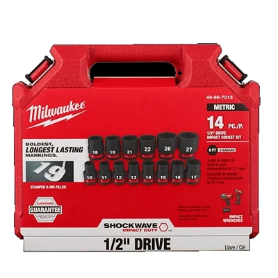 Milwaukee 49-66-7013 14pc 1/2" Drive Metric Standard 6 pt Socket Set features the boldest, longest-lasting markings and extreme impact durability in high torque applications. The stamped and ink-filled size marking enables you to select the right socket every time throughout the life of the socket. These sockets are engineered with high strength forged steel for optimized performance in heavy-duty applications. The non-slip hex geometry prevents fastener rounding, and a dual-hole design and ring groove allow for easy socket attachment and removal. The storage cases are impact resistant and nest together for easy stacking and storage. All MILWAUKEE SHOCKWAVE Impact Duty Sockets backed by a Lifetime Guarantee and meet ASME industry standards.