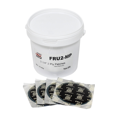 Rema 3-1/4" FRU Fabric Reinforced Universal Repair Unit will satisfy those technicians who require additional ply support within the patch body of the repair unit. This series of Universal Repair Units are round, non-directional units suitable for placement in the tread area of tires and can be safely used in both Bias and Radial constructed tires. These units utilize the same BL cement as all of Rema's blue-bonding system repair units. Should be used in conjunction with Rema RS Stem Units, or cavities filled with extruder rope and vulcanized. Packaged 25 per pail.