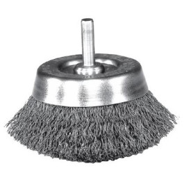 Weiler 2-3/4" Diameter Crimped Wire Cup Brush with 1/4" shaft. Wire size is .0118 and has a rpm rating of 6,000.