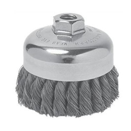 Weiler 3-1/2" Diameter Knot Type Wire Cup Brush with M10x1.25 AH. Wire size is .023 and has a rpm rating of 13,000.