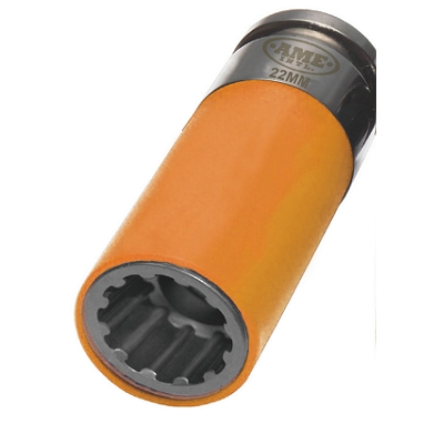 AME 68022 SUV/Lt. Truck Spline Plus Socket (22mm, 1/2" drive impact rated). Works in cases of corrosion, rounded heads, thin walls for specialty aluminum wheels, etc. Easily removes at least 6 different fastener types: spline, 6-point, 12-point, torx, square, and 50% rounded off heads. Manufactured using quality chrome molybdenum alloy steel for high strength and durability. Color coated protective sleeves for easy identification and prevents damage to finish on alloy wheels.