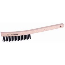 Curved Handle Wire Scratch Brush with round carbon steel wire. Staple set in a smooth wax tumbled hardwood block. Length of trim is 1-1/8".