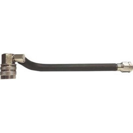 Haltec Motorcycle Chuck features an angled design to fit between the brake rotor and the hard to reach valve. Easy on/off locking coupler. Hardened steel pins for increased service life. 1/4" NPT female threads. 8" Long.