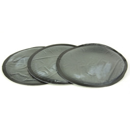 Xtra Seal 5" Giant Round Feather Edge Tube Repair will vulcanize chemically. These repairs are black with black vulcanizing gum on a white poly backing. Packaged 10 repairs per box. Ascot Part #541-11007.